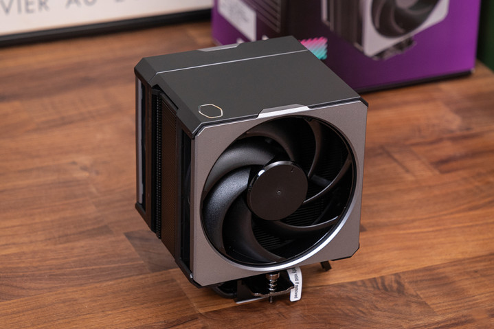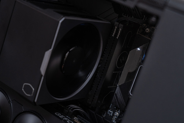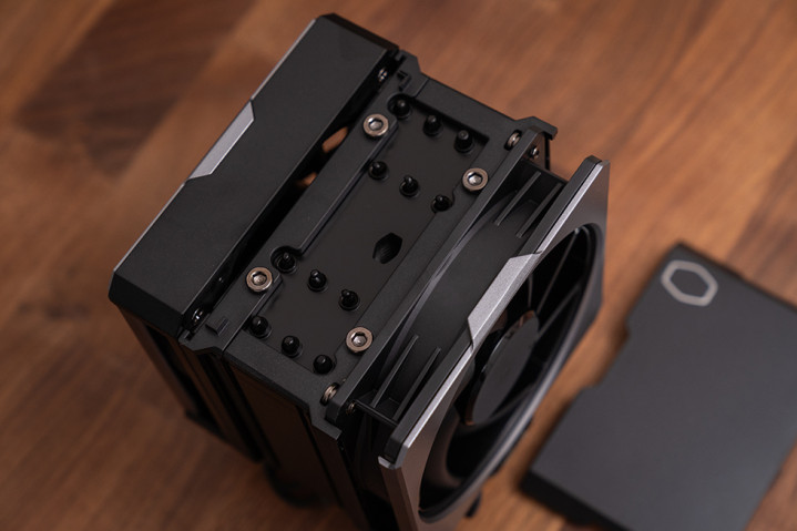 散热采用风冷模式,选用了酷冷至尊的Hyper 612 APEX搭配 莫比乌斯 120 VX风扇。Hyper 612 APEX整体尺寸为127mm x 114mm x 159mm,单塔双扇结构,整体造型简洁方正,遵循“black out”隐形设计美学,标称解热能力 260W。