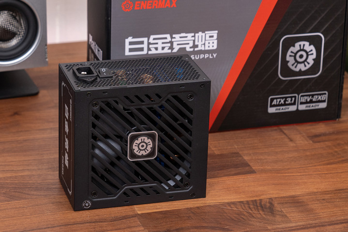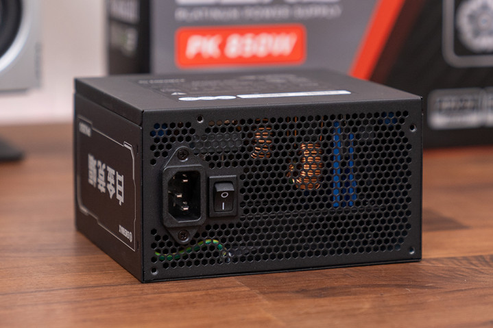 标准ATX 规格,三维尺寸是 150mm×140mm×86mm。内部搭载直径 12cm 的 FDB 液态轴承主散热风扇,型号为 S1202512L,规格为 12V/0.18A,支持 PWM 进行调速,电源出风面采用 6 边形镂空设计,有一个 AC 开关。
